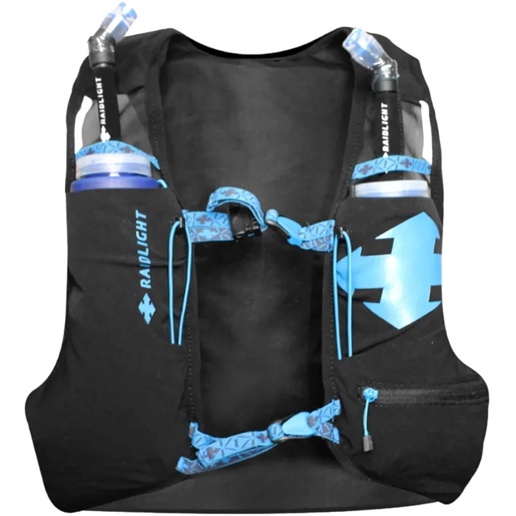 Le sac à dos de trail pour homme Raidlight Responsiv 6L, ici présenté en bleu, est spécialement conçu pour le transport de poches à eau et permet d’emporter le minimum nécessaire sur les trails de courte et moyenne distance.
